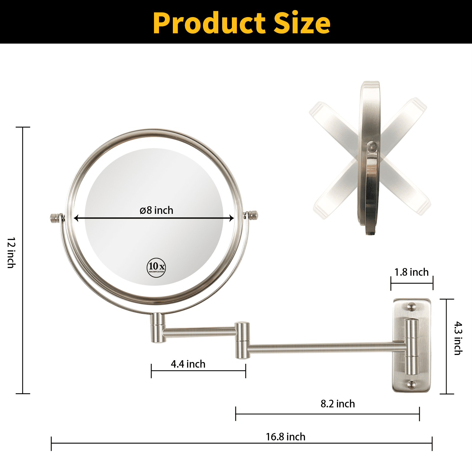 Double Side 1X/10X : The mirror have double side,1X normal magnifying mirror and 10x magnifying mirror that can allow you to see clearly your Every facial features tweezing.Tips:When using a 10x magnifying mirror, keep within 4 inches distance to avoid dizzy.Rechargeable LED Vanity Mirror: The wall mirror has a built-in 2000mAh rechargeable battery, no need to replace the batteries.T-C charging port adapts to most USB charging cables (included), convenient for you to use it anywhere.Stepless Dimming and 3 Color Lighting: Providing long-time natural light, warm light and cold light for your choice, you can apply 3 different settings to get different lighting effects.Easily change light patterns by single touch switch and long press to adjust the brightness.Tips:The lights will turn off automatically after thirty minutes.360° Swivel and Extendable Metal Arm: This makeup mirror is designed with an extending arm that you can smoothly extend and fold,and the long arm can be adjusted up and down to suit people with different needs.The max lenghs of extension arm is 14.7".Widely Used:Best choice for makeup, draw eyeliner, draw eyelashes, lipstick, shaving, wearing contact lenses, eyebrow tweezing, eyebrow shaping, wear contact lenses and facial care.Decorate Room more Beautifully&Space-Saving: This wall mounted makeup mirror is the ideal of decorating your dressing table, bathroom, bedroom headboard, hotel, toilet, etc. Factory direct selling!Ideal Gift:This vanity makeup mirror it is not only the best gift for wife's wedding anniversary, girlfriend, teen girl, child's birthday, mother's birthday, Valentine's Day, Mother's Day, Christmas and Thanksgiving Day.