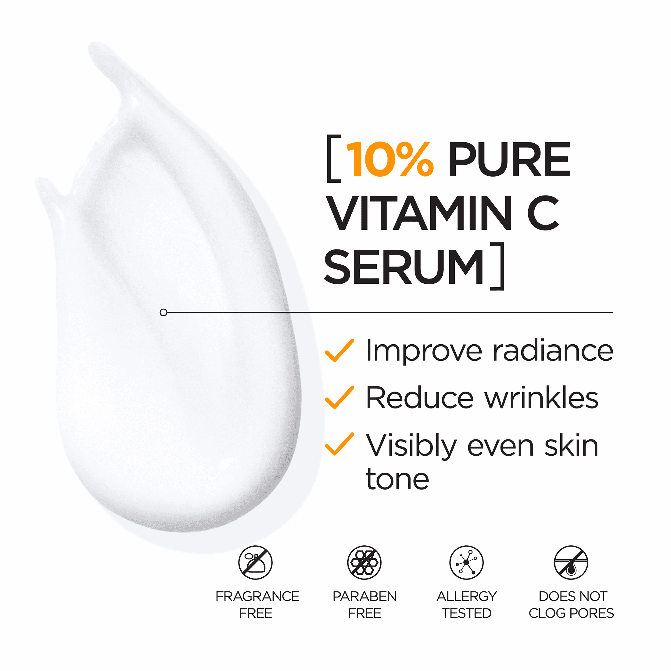L'Oreal Paris Revitalift Pure Vitamin C Concentrate Serum, is a potent and dermatologist-validated serum that visibly brightens skin in 1 week, improves fine lines and uneven tone in 2 weeks, and visibly reduces wrinkles, dark spots and pores in 4 weeks. Our Vitamin C cream formula is infused with Hyaluronic Acid for added hydration to make the skin look radiant and more youthful. WHAT IS VITAMIN C? Vitamin C is a vital antioxidant naturally found in skin and recommended by dermatologists to boost radiance, brighten skin, and neutralize free radicals that may lead to visible signs of aging.