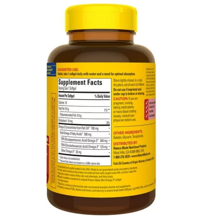 One daily Fish Oil Nature Made Omega 3 (1) mini softgel provides 340 mg of EPA and 125 mg of DHA to support a healthy heart
