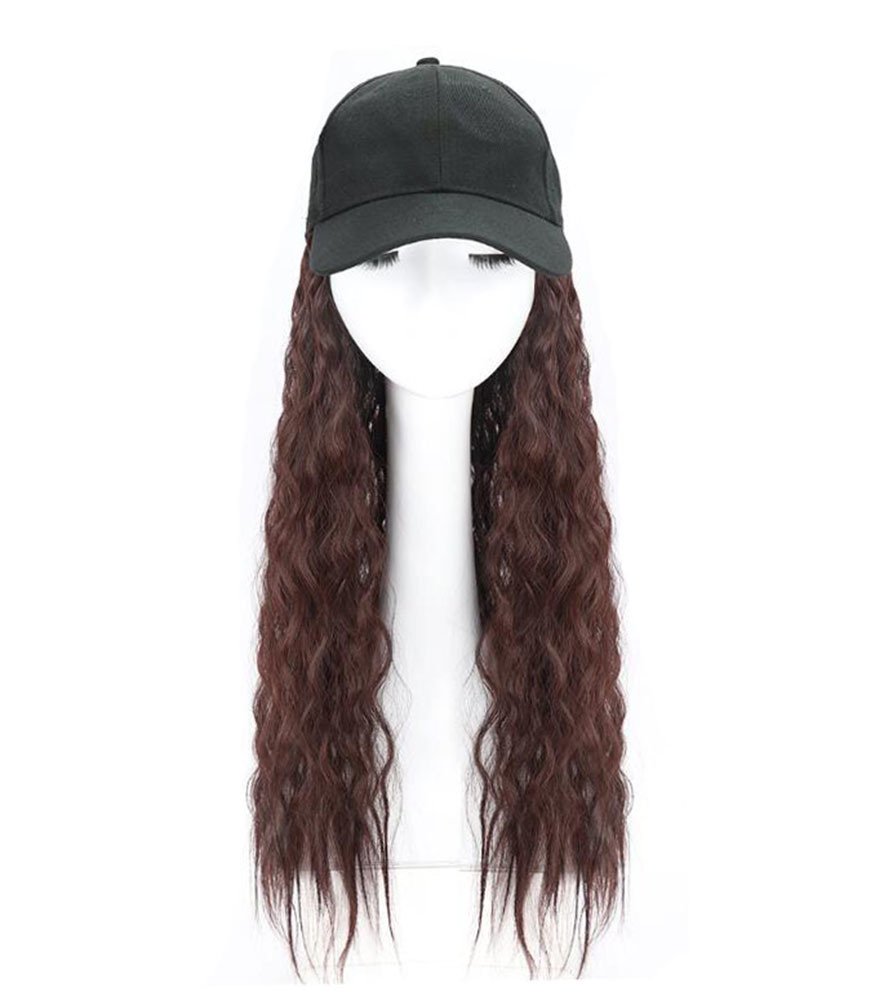 Synthetic Hair Extensions Long Curly Corn Wave Hair Attached With Baseball Cap, Dark Brown
