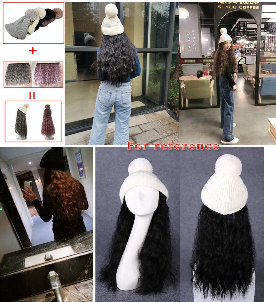 Womens Winter Knit Hat with Synthetic Long Curly Corn Wave Hair Attached, Natural Black Wig Cap Womens Winter Knit Hat with Synthetic Long Curly Corn Wave Hair Attached, Natural Black Wig Cap