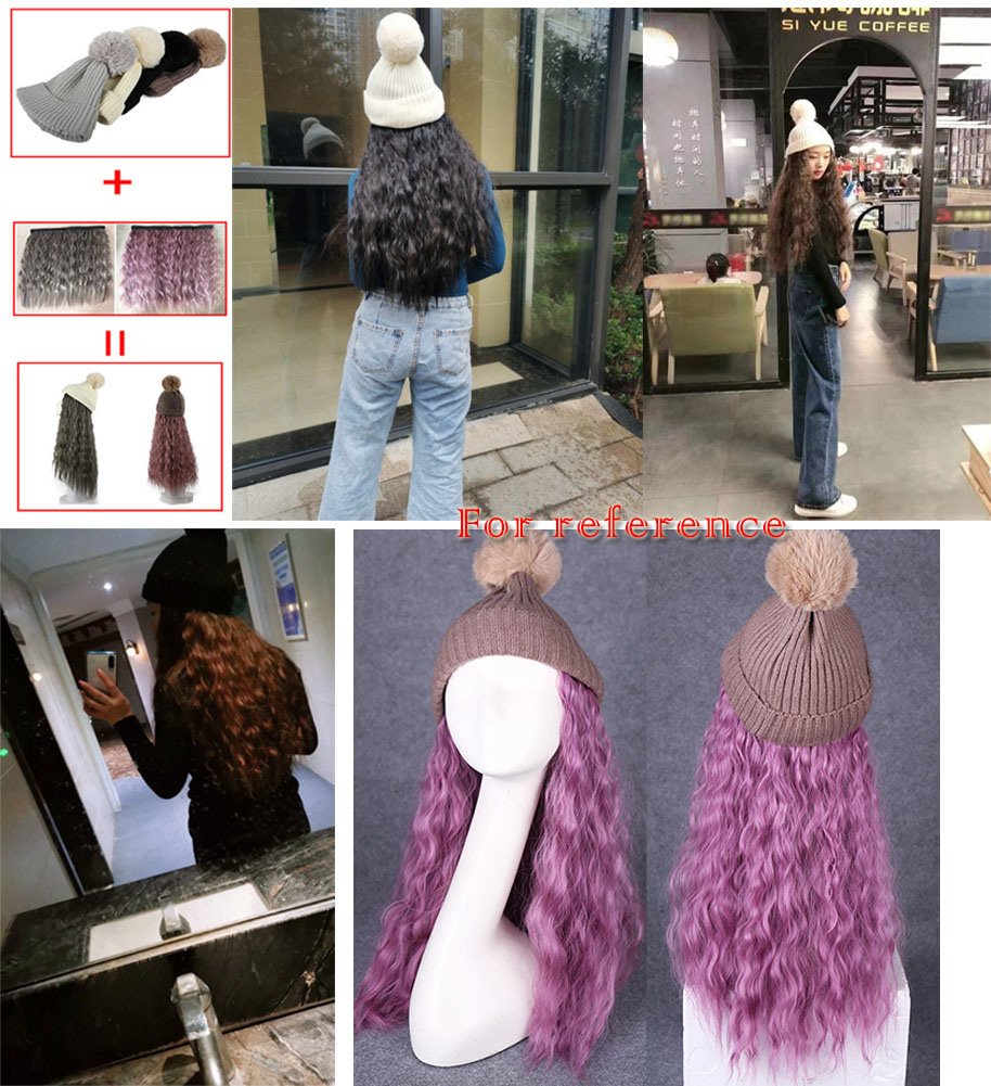 Womes Winter Pink Knit Hat with Grey Purple Synthetic Long Curly Corn Wave Hair Attached Wig Cap Womes Winter Pink Knit Hat with Grey Purple Synthetic Long Curly Corn Wave Hair Attached Wig Cap